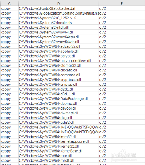 5、新建一个excel文件,将这些内容复制到Excel文件中,将前几列清除,只留下路径一列,然后在前面一列填写xcopy,在后一列填写要复制的目标路径,如图:
