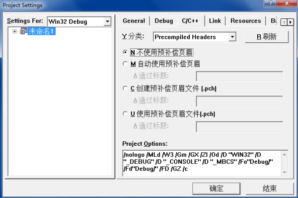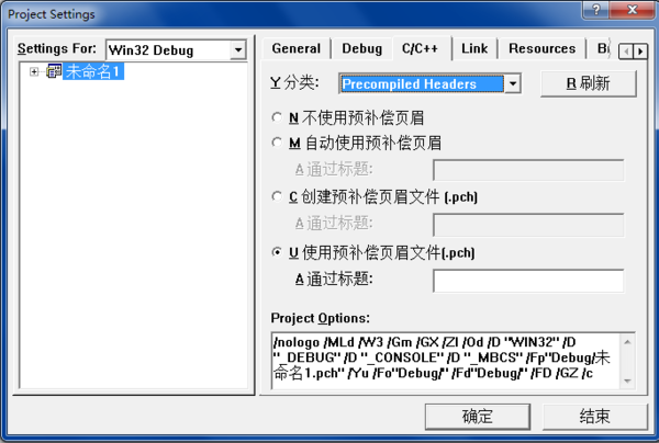 在vc中,依次点击”project”->”settings”,选中”c/c++”标签,在分类中选择”precompiled header”,如果设置如下,则会出现cl.exe执行错误的问题