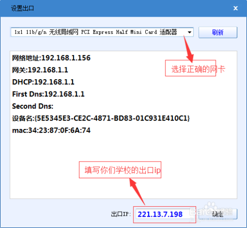 首先选择自己的本地网卡,也就是直接连接在drcom环境下的网卡,对应有ip参数可以自己判断。注意:169.254.*这类ip是无效ip参数)接着就是找服务器的出口ip,有两种方法可以找到服务器出口ip: