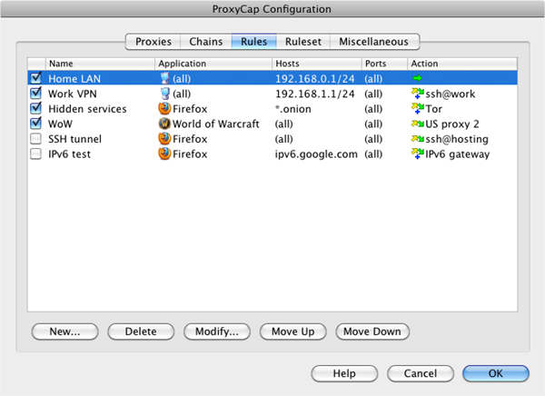ProxyCap分享灵活的规则系统,允许您定义自己的路由规则。您可以使用不同的规则标准,例如:应用程序,目标端口范围,目标IP地址范围和目标主机名。只需点击几下鼠标即可添加新规则。