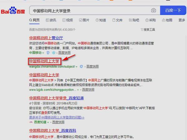 1、打开电脑浏览器,百度搜索【中国移动网上大学】如图。