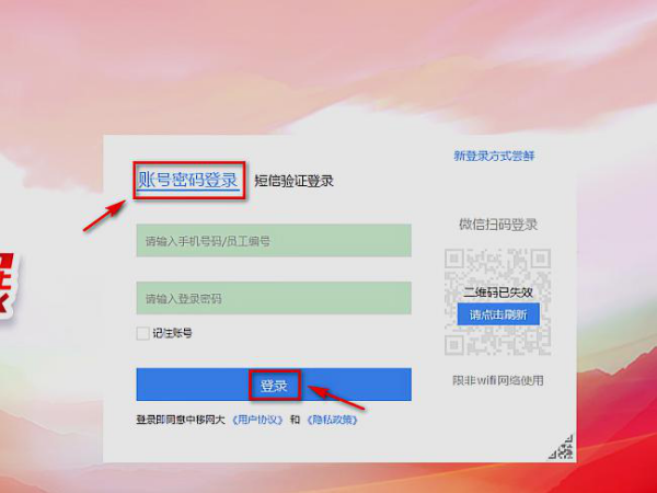 2、选择【账号密码登录】输入【手机号/员工编号】【密码】点击【登录】即可。