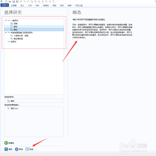 第三步:确定研究问题所使用的研究方法。如图所示。如稳态或瞬态问题。comsol分享接口选择。