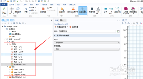 第四步:进入最终模型导航,建立所研究问题的几何结构以及所需要的材料属性,如图所示。材料属性可以自己定义,也可以通过comsol内置材料库调取使用。