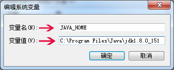 在“编辑系统变量”窗口,“变量名”对应的输入框内输入“JAVA_HOME”,在“变量值”对应的输入框内输入“C:\Program Files\Java\jdk1.8.0_151”(注意:这里应填入开发者JDK实际的安装路径),单击“确定”按钮即可。