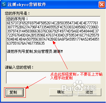 初次启动时软件会弹出密钥植入窗口,点击左下方的复制按钮将序列号复制发给SKYCC客服人员(注意不要直接手动复制),然后将skycc客服人员回传过来的软件密钥粘贴进去,点击确定,显示密钥已植入。