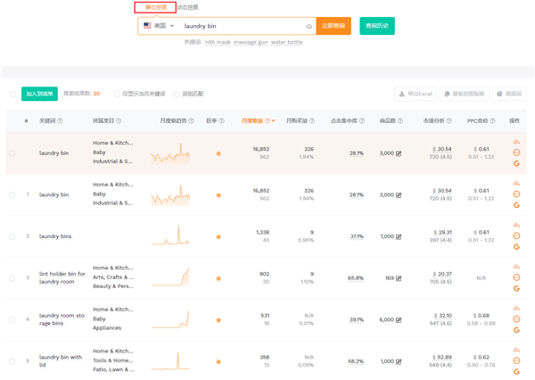 全部的关键词20个,主关键词laundry bin排在第一位,其他关键词按月搜索量依次排列。根据观察,静态挖掘搜索出来的关键词都是包含了laundry bin这两个单词的关键词,例如衔接在一起的laundry bin with lid;不衔接在一起的lint bin for laundry room。但都是包含了laundry bin的单词,说明静态挖掘是在对这个单词本进行延展。