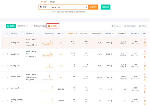 点击【词组匹配】,再点击【立即搜索】就会发现搜索出来的关键词只有10个。这时候,只会展示衔接在一起的laundry bin的相关词组。