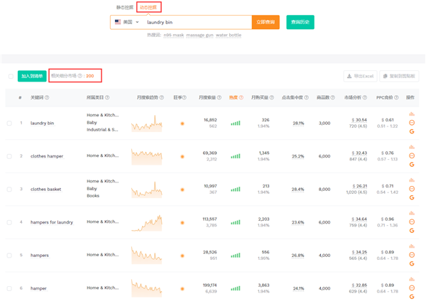 再看动态挖掘,在搜索框上方点击【动态挖掘】,输入laundry bin,点击【立即查询】