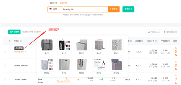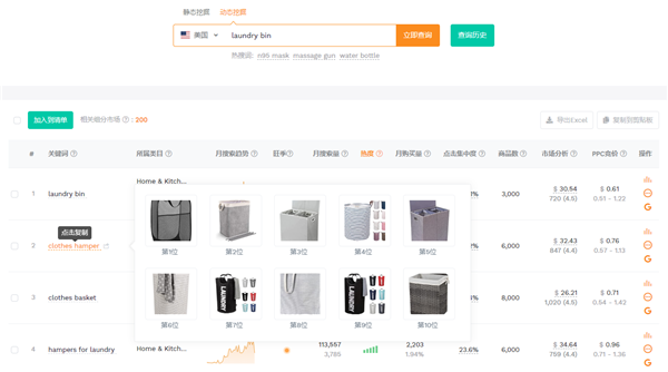 将鼠标悬停在关键词上可以查看关键词下排名前10的产品,首先是laundry bin