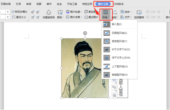 1、使用WPS Office打开文档,选中图片,设置“环绕”为非嵌入型(如“四周型环绕”)。
