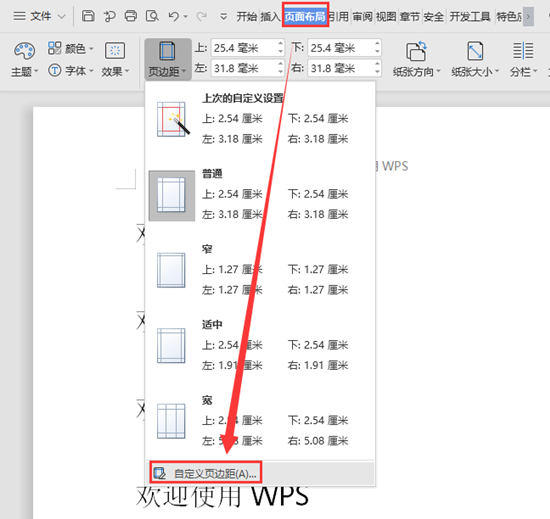 使用WPS Office打开文档,依次点击“页面布局”—>“页边距”—>“自定义页边距”。