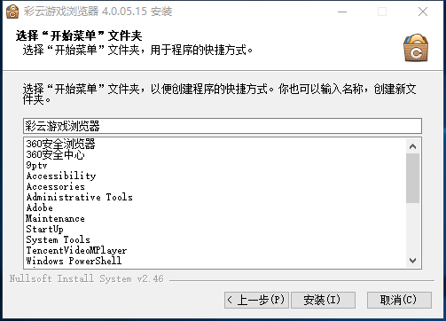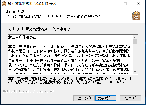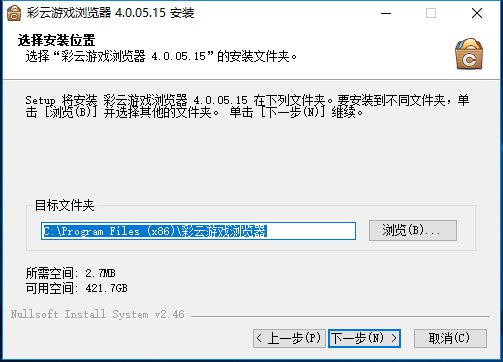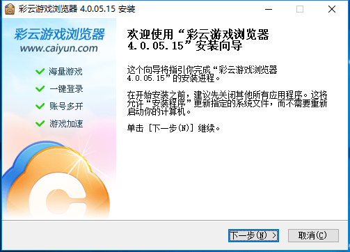 1、下载彩云游戏浏览器最新安装包,双击打开点击下一步