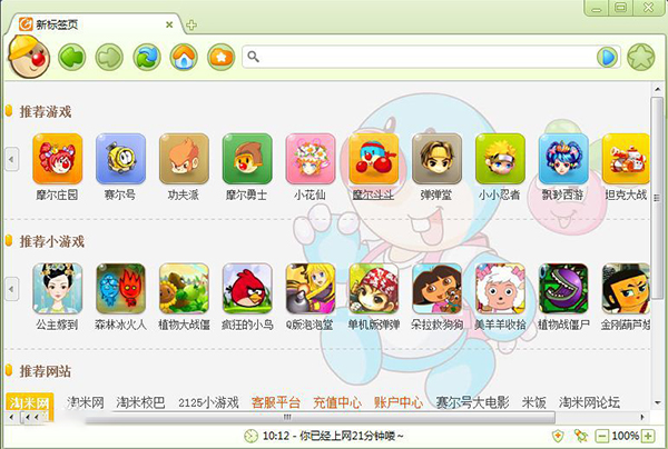 淘米儿童浏览器为摩尔庄园和赛尔号两款游戏分享加速功能,用户只要安装了淘米儿童浏览器,玩摩尔庄园,赛尔号就再也不用忍受漫长的等待过程了。通过看底部栏的加速状态显示图标就可以立即知道当前的加速状态。