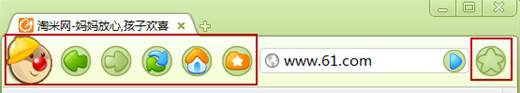 淘米儿童浏览器的顶部有6个工具按钮,设置,前进,后退,刷新,主页,收藏夹,收藏操作。
