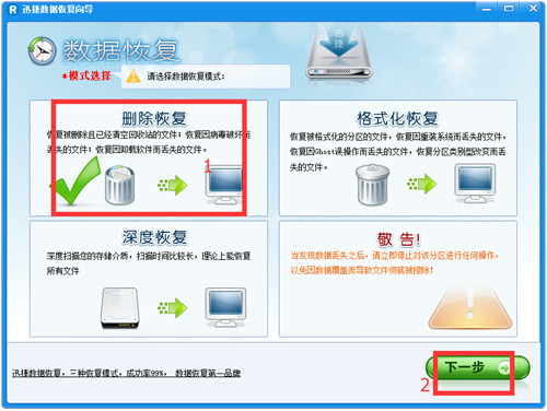 2.选择数据恢复模式,根据个人实际情况(在这里我们假设不小心删除的是D盘下文件 并已经清空回收站。)选择删除恢复,并单击下一步;