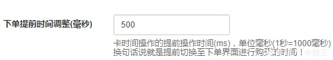 3.下单提前时间调整(毫秒)默认是500,如果电脑配置高,请适当调低,不然会提前提交订单导致不变价,被挤爆了,小二忙等等限制。