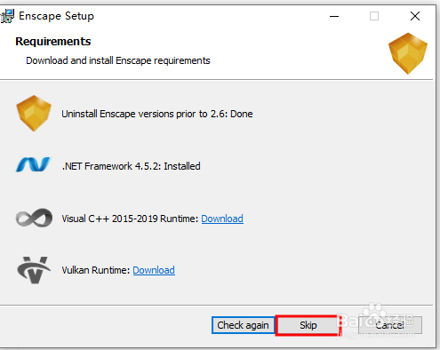 然后会打开一个安装向导界面,这里显示的是四个条件,依次完成安装,完成后点击check again,最后点击skip开始安装