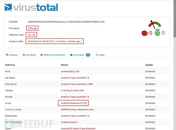 VirusTotal会完全扫描你的移动设备上安装的所有程序。如果这款应用程序已经被VirusTotal扫描过或者被一个以上的病毒软件厂商检测过,其结果就会显示一个红色的机器人图标、如果没有被检测过就会显示绿色、如果是VirusTotal未知的软件则会显示蓝色的机器人图标。VirusTotal已经支持超过40个恶意程序检测引擎的支持,结果更加全面。