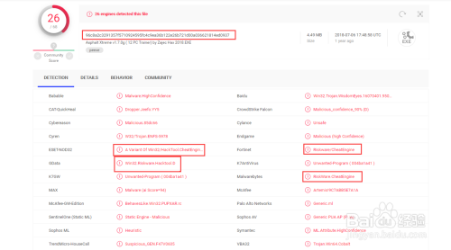上传完毕或者计算校验和找到匹配之后,会来到检查结果页面。页面给出了文件校验和和各种杀毒软件的检查结果。我们可以看到,其中一些杀毒软件甚至给出了详细的分类。