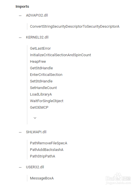 展开Imports,我们可以看到程序引用了那些具体的API。通过这个我们可以了解恶意程序可能做的事情。