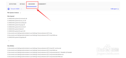切换到BEHAVIOR选项卡,可以查看程序在沙河里运行测试的行为,包括打开了哪些文件,写了哪些文件,请求了哪些权限等。