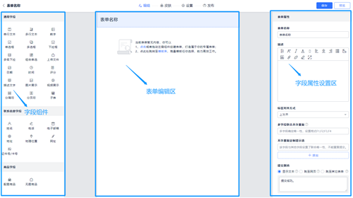 3、右侧是字段属性设置区域,可对表单及表单内每一个已添加的字段进行属性设置,比如你添加了姓名并将这个字段设置为必须输入,那么在填表时,这个字段没有输入内容无法提交表单。