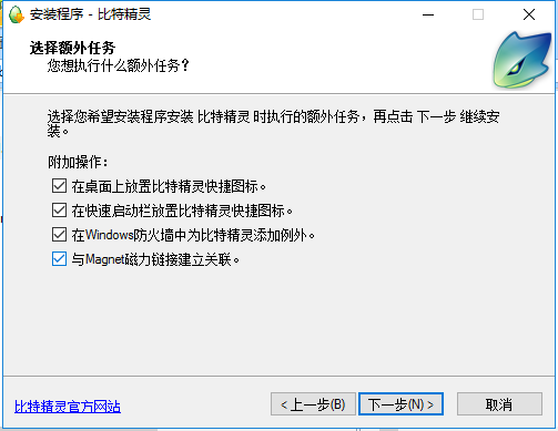 5、选择比特精灵(BitSpirit)额外安装任务,您可以自行勾选您要安装的程序,选择完成后点击【下一步】。小编建议默认就可以了。