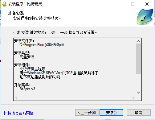 6、准备安装比特精灵(BitSpirit),您可以先检查您软件安装位置,安装类型,安装组件是否正确,如果正确点击【安装】,如果有误点击【上一步】进行修改。