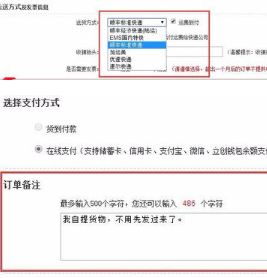 2、在整个信息界面中需要注意的是快递寄送方式和备注要填写好,快递选择“顺丰标准快递”,然后勾选运费到付选项,同时在信息下面的备注中填写好货物自提备注