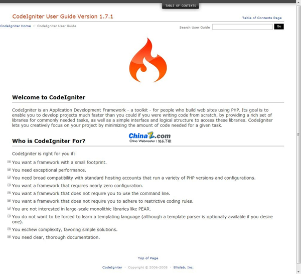 CodeIgniter 安装包中包含《用户手册》,手册囊括了入门介绍、教程、“手把手”指导,还包括了框架组件的参考文档。