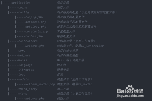 这里我们可以看到有三个文件夹,分别是application(项目目录)、system(框架源码)、user_guide(用户手册,可以删除),index.php为程序入口文件,我们的代码编写工作主要在application目录下完成,这里有着清晰的MVC结构,这里我们主要操作controllers、models、views目录,配置信息主要修改config中的config.php、database.php、autoload.php、constants.php、routes.php文件。