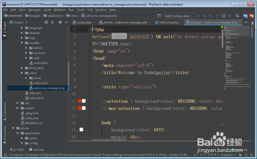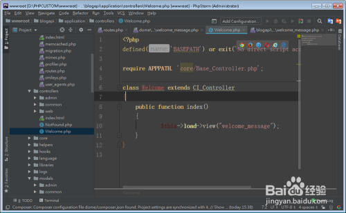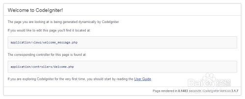 在控制器的index方法中我们可以看到,方法将视图指向了views中的welcome_message.php页面,$this->load->view(“welcome_message”),这样我们就去加载了welcome_message.php页面了,也就是我们看到的Welcome to Codelgniter页面的后台代码了,在视图中我们就可以对业务逻辑和对数据库进行处理了。