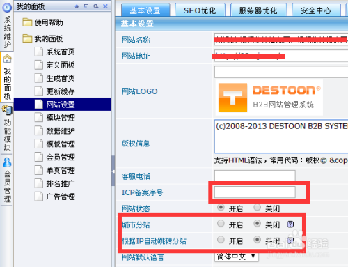 登陆后台,进行网站设置。设置网站名称,网站地址,网站LOGO还有网站版权信息,客服电话,ICP备案号。网站上线前期小编建议还是不要开启分站。