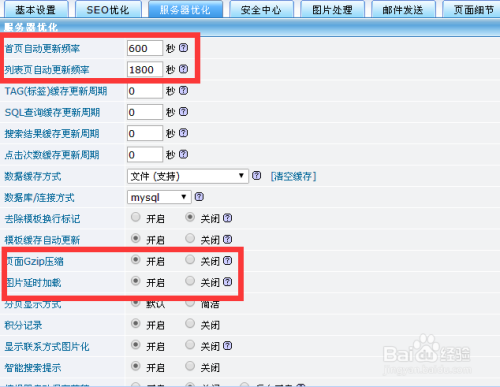 服务器优化,“首页自动更新频率”和“列表页自动更新频率”这个更新时间可以根据自己的需求修改,但只是针对生成静态页面。没有开启伪静态的不需要管。服务器支持Gzip,建议开启。图片延时加载开启,可减少服务器开销。