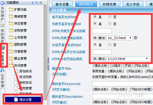 下面是功能模块的设置,功能模块的基本设置,小编建议还是选择默认,不用怎么修改。也可根据自己的需要修改,主要还是SEO优化设置,服务器支持伪静态,就开启伪静态,不支持伪静态的,则跳过。