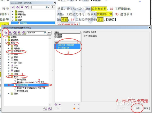 2、在新建的“未命名”动作中,双击打开“动作编辑器”对话框中,在“标准”-“位置和大小”选项卡中,找到“选择区域内部或外部的对象”,双击添加该动作。