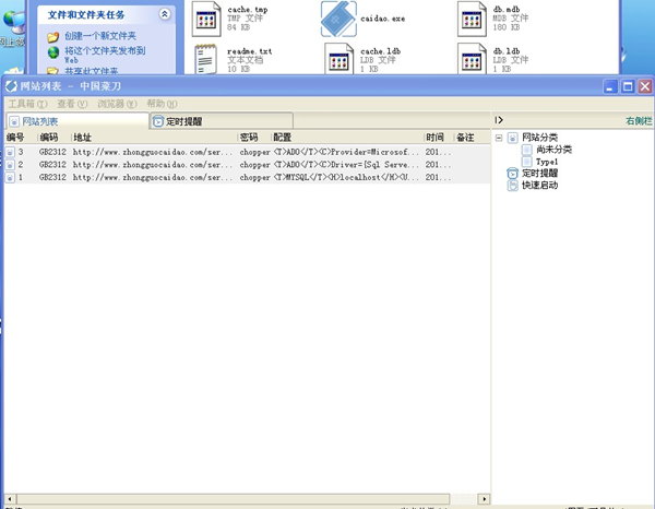 中国菜刀是一款专业的网站管理软件,用途广泛,使用方便,小巧实用。只要支持动态脚本的网站,都可以用中国菜刀来进行管理!程序大小:214K,在非简体中文环境下使用,自动切换到英文界面。UINCODE方式编译,支持多国语言输入显示。