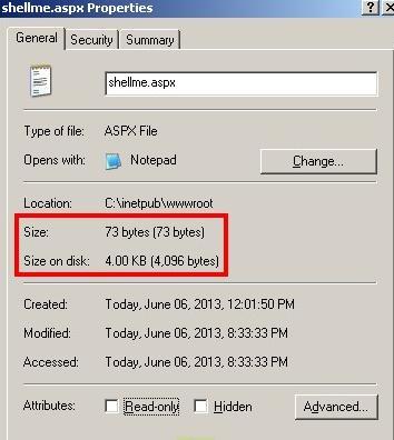 中国菜刀的服务端脚本非常小,是典型的一句话木马,其中aspx服务端软件只有73字节,见图,相比其他传统的webshell可见它的优越性。