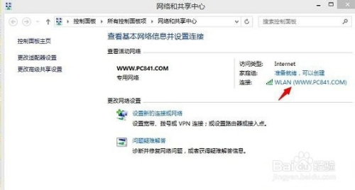 打开网络共享中心后,点击已经连接的网络名称(下图演示的为笔者无线上网的笔记本,有网线连接的电脑为本地连接),如下图所示: