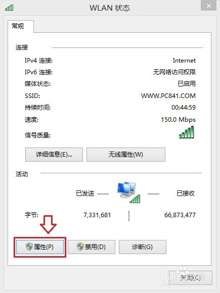 接下来会打开WLAN状态设置,我们再点击下方的“属性”设置,如下图所示: