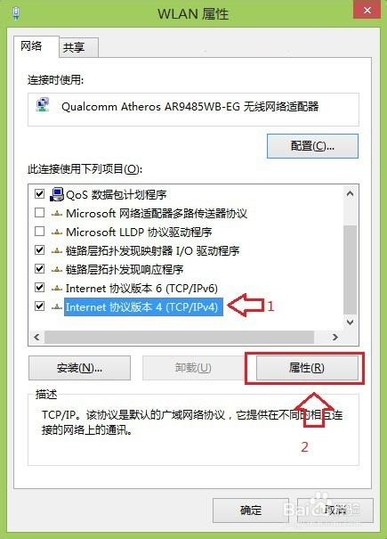 打开WLAN属性设置后,在此连接使用下列项目中,先选中底部的“Internet协议版本4(TCP/IPv4)”,接下来再点击下方的“属性”,如下图所示: