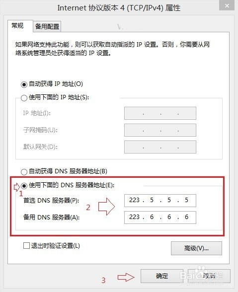 最后进入TCP/IPv4协议属性设置界面了,这里方面就可以找到DNS地址的地方,先选中“使用下面的DNS服务器地址,将首选DNS服务器地址填写为阿里DNS的223.5.5.5,而备用服务器地址填写为223.5.5.5,完成后点击底部的确定即可。如下图所示: