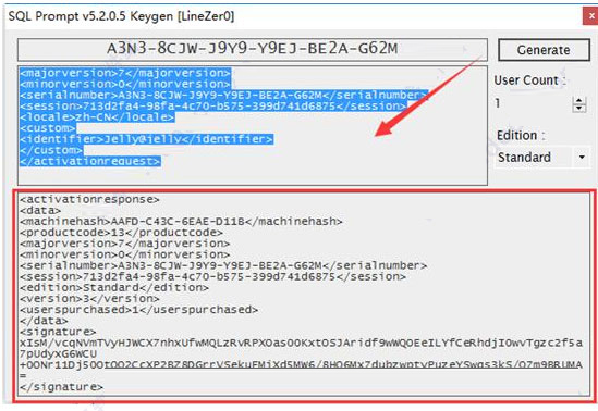 8、将弹出的离线注册窗口中的左侧代码覆盖到注册机中间的文本框内点击Generate按钮,就会在注册机的最下面的栏位生成相应的注册代码