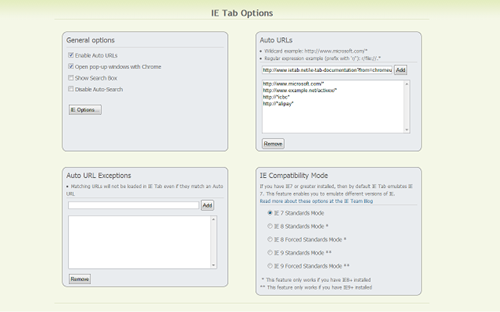 这可以使用自动URL高级选项来完成,这意味着在自动URL字符串前加上方括号,并在括号中设置相应的兼容模式标识符。这将确定每当打开匹配的URL时要使用的兼容性模式。可以使用以下兼容模式: