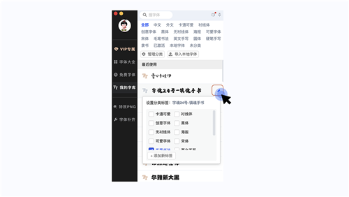设置字体分类:点击选择需要管理的字体,点击编辑图标,勾选需要设置的分类。自定义字体分类,你只需要点击添加新标签即可。