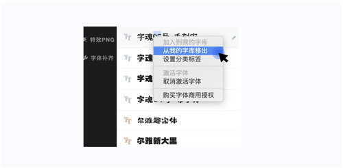 删除本地字库字体:鼠标右击选中需要删除的字体,选择从我的字库移出,即可把该款字体从本地字库移除啦!
