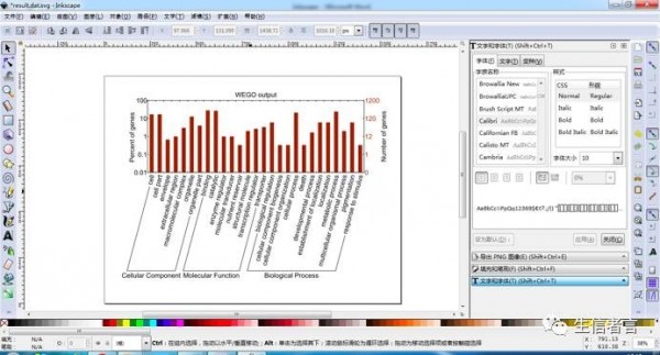 4.删除冗余图像信息,使用工具 单击“Number of genes”和“WEGO output”,单击右键选择“删除”,接着框选图像右边的数字和标尺格以及图像上角的标尺格单击右键选择“删除”,结果如下图所示,此时图像显得简单直观:
