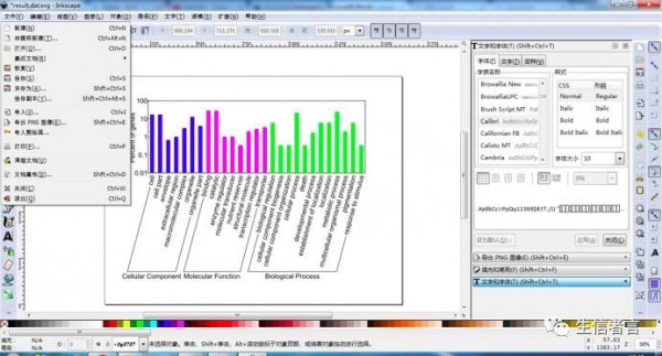 5.图像填色,使用工具 ,首先按住“shift”键进行多项选择“cellular component”相对应的柱状,然后单击调色区选择填充颜色,以此类推完成'molecular function' 和'biological process' 图像填充,最终效果图如下所示: