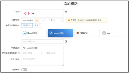 矿池/钱包:定义你想使用的矿池和你挖矿的钱包,如果你有多台矿机,建议你定义多个挖矿模版,就可以定义不同的矿池,一旦某个矿池发生故障,也可以及时的给矿机切换模版,换到另一个矿池,这个使用非常灵活。模版内帮您定义了常用的矿池,直接选择即可,如果你是用的其他的矿池,也可以选择自定义矿池;